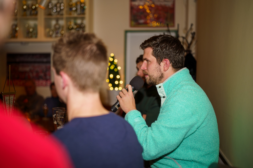 Auch die Situation einiger jüngerer Kräfte im Kader der 47er wurde beleuchtet und die Frage geklärt, warum es nicht so einfach war oder ist, denen entsprechend Spielzeit zu verschaffen. Von unseren beiden Rückkehrern Gawe und Gruber war zu hören, dass es sich für sie so angefühlt hat, als ob sie nie weg gewesen wären. Und Gawe spielte seine Freist0ßkünste runter: „Ich habe mal gelernt, dass man da keine Kunststücke fabrizieren soll, sondern einfach nur den Ball aufs Tor bringen muss. Da kann ja immer mal ein Fehler passieren.“